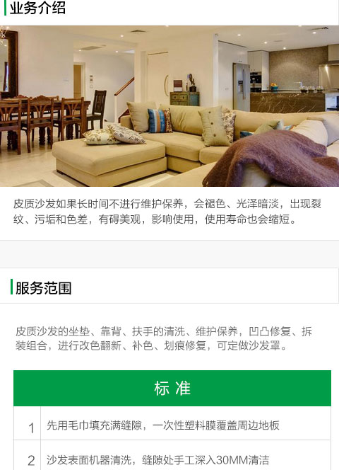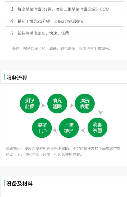 皮質(zhì)區(qū)域、面積、同材質(zhì)沙發(fā)背部或底部10cm2。沙發(fā)表面機器清洗,縫隙處手工深入30mm清潔。 殺菌消毒每座3分鐘,噴槍口距殺菌消毒區(qū)域5-8cm。 上蠟前干燥約25分鐘,上蠟3分鐘后拋光。新純棉毛巾拋光、快速、輕柔。